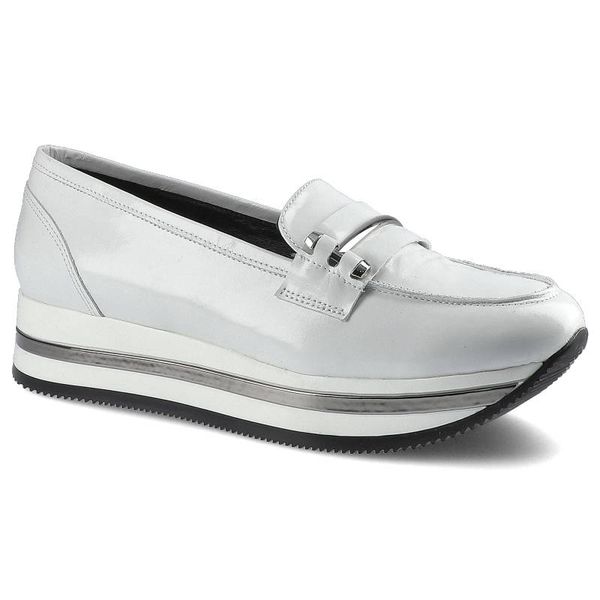Półbuty damskie Karino, naturalna skóra licowa o lakierowanym wykończeniu w jasnym kolorze z paskiem na podbiciu oraz wielowarstwową podeszwą z kontr