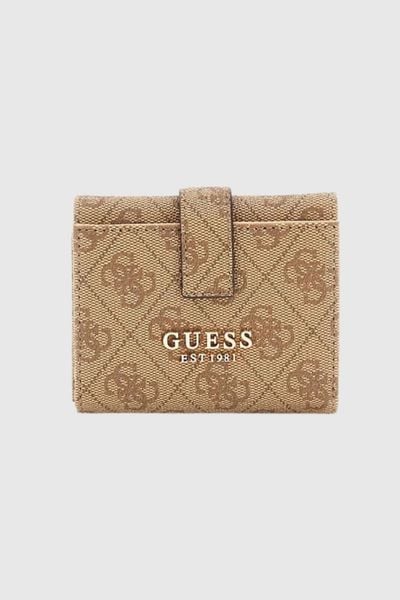 Beżowy damski portfel ze skóry ekologicznej marki Guess. Zamykany na zatrzask, wewnątrz zasuwana kieszeń na bilon, sześć miejsc na karty i wsuwana kieszeń na banknoty.