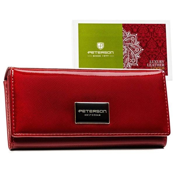 Czerwony portfel damski z przegródkami Peterson. Wykonany z wysokojakościowej lakierowanej skóry naturalnej. Zamykany klapą z mocnym, bezpiecznym zatrzaskiem. Portfel z miejscem na dokumenty oraz gotówkę. Zabezpieczony systemem RFID!