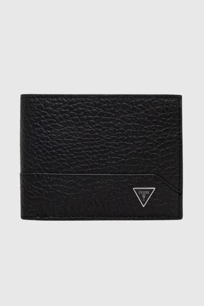 Czarny męski portfel ze skóry naturalnej marki Guess. Posiada zamykaną na zatrzaska kieszeń na bilon, osiem miejsc na karty, dwie wsuwane kieszenie i dwie przegrody.