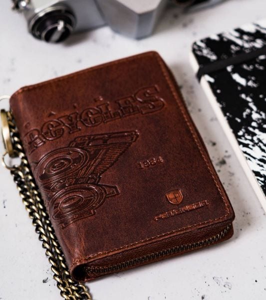 Pionowy portfel męski z nabłyszczanej skóry naturalnej klasy premium. Wyposażony w wiele wygodnych zakładek na karty oraz duże schowki na dokumenty formatu dowodu rejestracyjnego. Akcesorium zapinane za pomocą suwaka. W zestawie długi łańcuch.