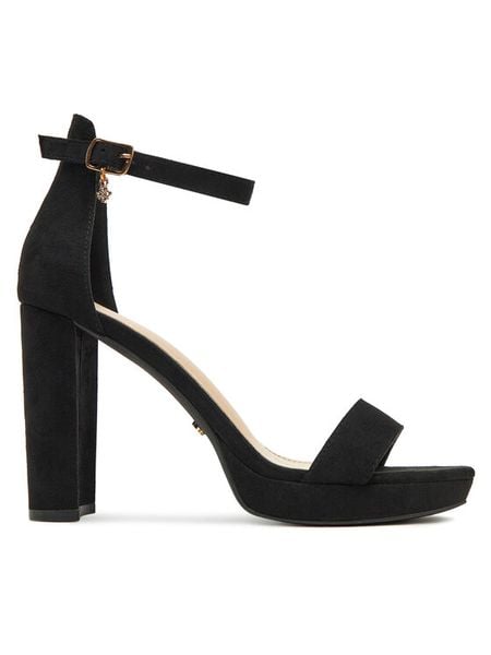 Czarne Sandały z Ekozamszu na Niskim Słupku o Ażurowym Wykończeniu z Ozdobnymi Nitami Panessi