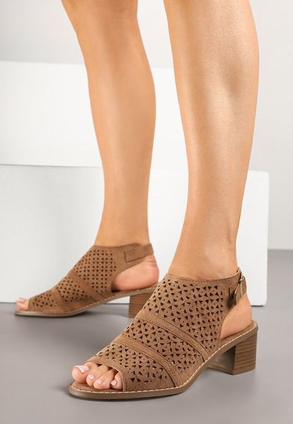 Ciemnobeżowe Sandały Botki na Słupku z Ażurową Cholewką i Noskiem Peep Toe Lanira