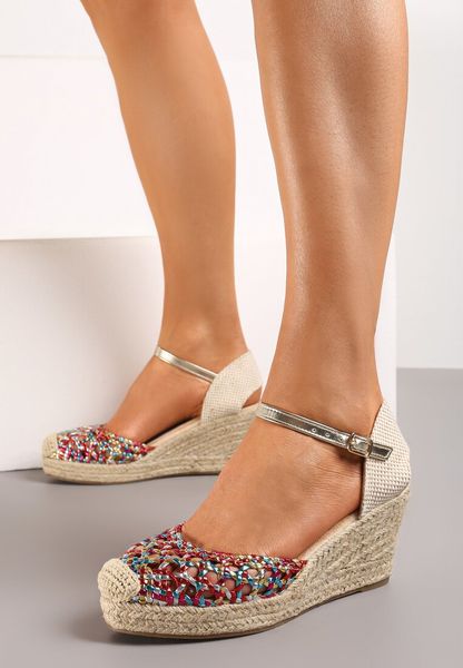 Beżowe Sandały na Koturnie z Jutową Plecionką i Ażurową Cholewką ze Sprzączką Witheria