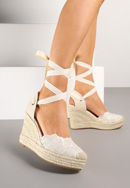 Beżowe Sandały na Koturnie z Plecionki z Haftem i Ozdobnym Wiązaniem Mevolina