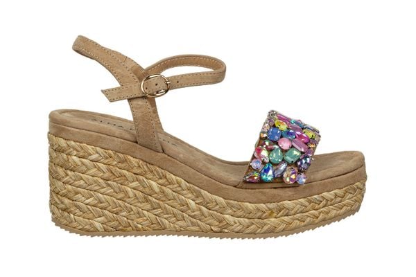 Sandały hiszpańskiej marki Alma En Pena w kolorze beżowym z kolorowymi aplikacjami. Eleganckie sandały typu espadryle na niskim koturnie i platformie. Paski ozdobione migoczącymi lustrzanymi kryształkami, co nadaje im wyjątkowego blasku i elegancji.Zapięcie regulowane na sprzączkę.Wkładka ze skóry ekologicznej.Podeszwa ozdobiona plecionką, od spodu antypoślizgowa guma.Kolor złoty sprawia, że są one uniwersalne i doskonale komponują się […]