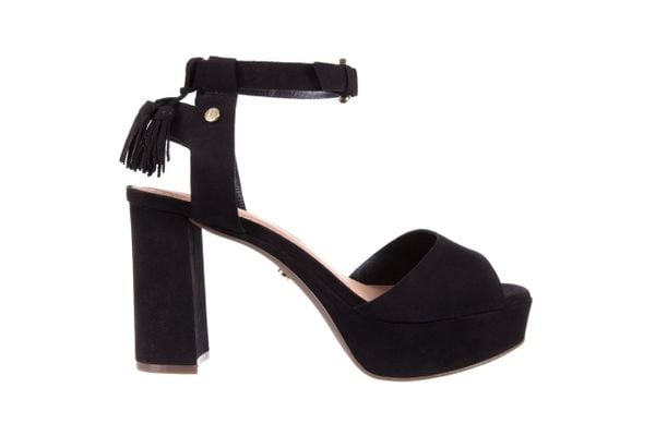 Czarne sandały z linii Bayla Exclusive. Paski wykonane są wysokiej jakości skóry naturalnej – nubuku. Wkładki oraz wyściółka to również miękka skóra naturalna. 3 cm platforma niweluje 10 cm obcas. Z boku ozdobione małymi frędzelkami.Buty są lekkie i wygodne. To doskonały wybór dla kobiet ceniących wygodę i modny look.