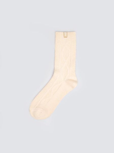 Beżowe skarpetki o warkoczowym splocie z delikatnej w dotyku przędzy wiskozowej z dodatkiem kaszmiru.Na ściagaczu miękka naszywka z logo marki.