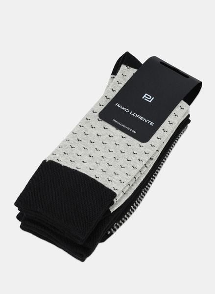 Zestaw skarpet męskich – Pako Lorente. Zestaw 3 par skarpetek we wzorki szaro-czarne. Skład: 69% bawełna, 28% poliester, 3% elastan.