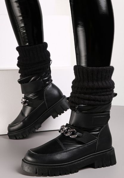 Śniegowce Simbil z pikowaną cholewką za kostkę. Zapinane na rzep, bez zamka błyskawicznego. Na przeodzie ozdobny łańcuch. Metaliczne śniegowce Simbil są w środku mocno ocieplone sztucznym futerkiem.