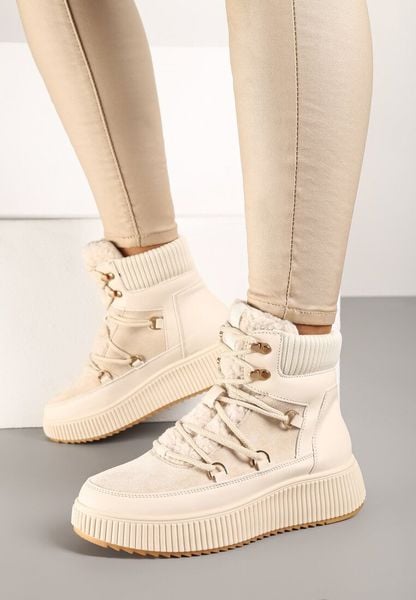 Beżowe Sznurowane Śniegowce Vices na Grubej Podeszwie Ozdobione Futerkiem Nomizola