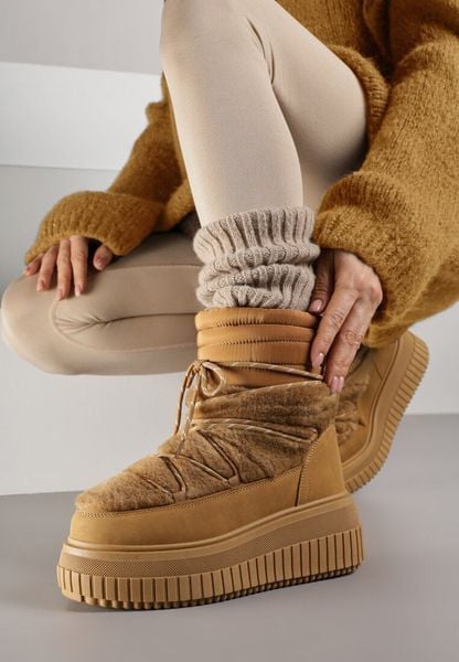 Jasnobrązowe Niskie Śniegowce Ekozamszowe na Platformie z Pikowaniem i Futerkiem Realira