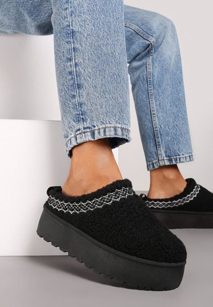 Czarne Niskie Śniegowce na Grubej Podeszwie Ozdobione Barankowym Futerkiem i Wzorzystym Przeszyciem Aziara