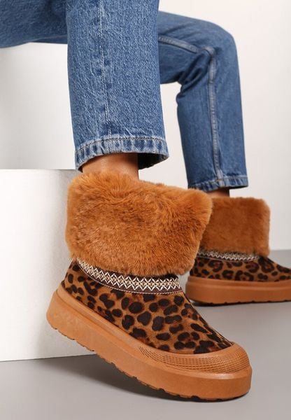 Brązowe Śniegowce na Płaskiej Podeszwie Ozdobione Futerkiem Haftem i Wzorem w Panterkę Lannetea