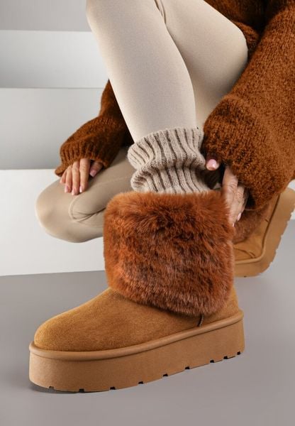 Jasnobrązowe Śniegowce za Kostkę Mocno Ocieplane z Futerkiem na Platformie Reilanna