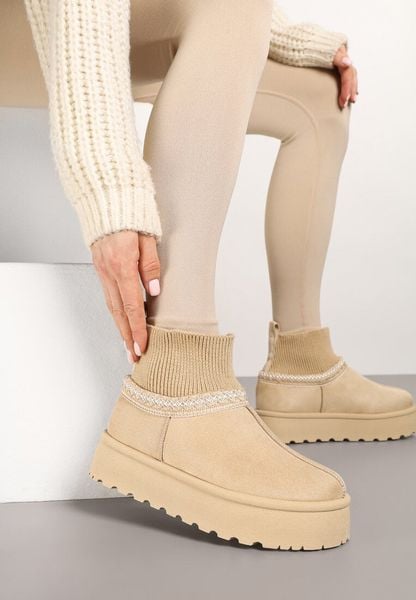 Beżowe Śniegowce z Imitacji Zamszu na Grubej Podeszwie z Niską Cholewką Ennitha