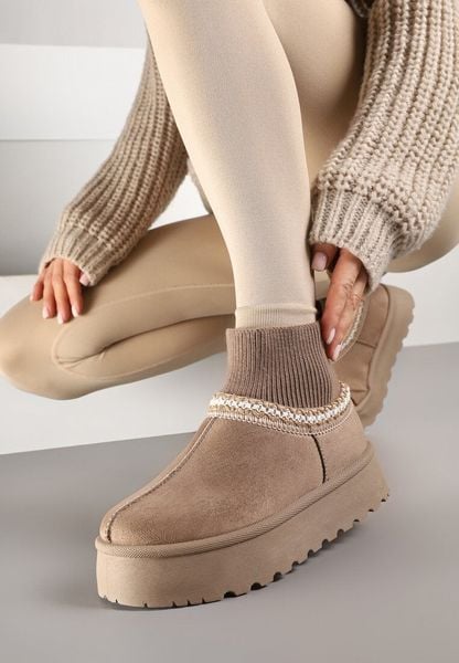 Ciemnobeżowe Śniegowce na Grubej Podeszwie z Niską Haftowaną Cholewką Etandiel