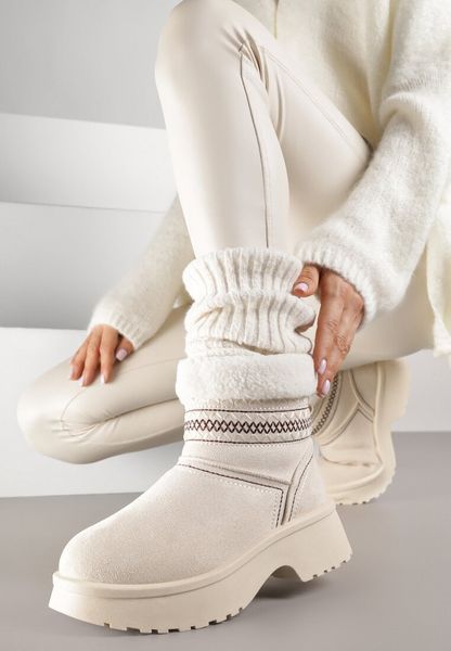 Beżowe Krótkie Śniegowce Wsuwane z Haftem i Futerkiem przy Cholewce Miovadia