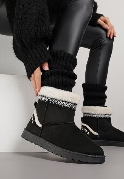 Czarne Śniegowce o Wsuwanym Fasonie z Haftem i Futrem przy Cholewce Mevinadia