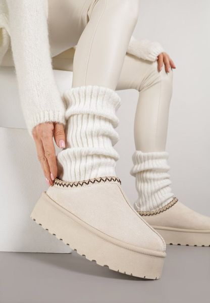 Beżowe Śniegowce na Platformie z Niską Cholewką i Haftowanym Wzorem Zivilae