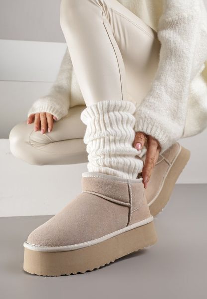 Beżowe Wsuwane Śniegowce na Platformie z Cholewką z Zamszu Naturalnego Mevelessa
