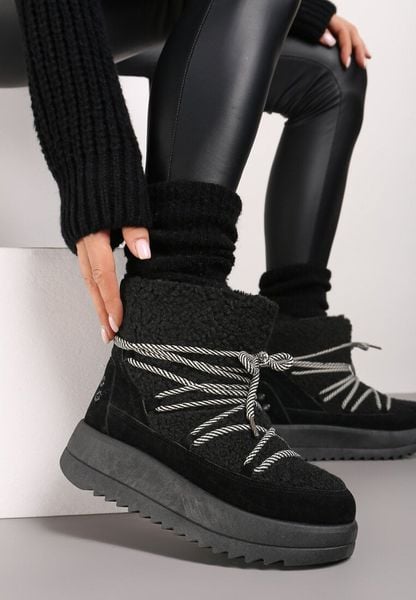 Czarne Niezapinane Śniegowce na Niskiej Platformie z Futerkiem i Sznurowaniem Avalisande