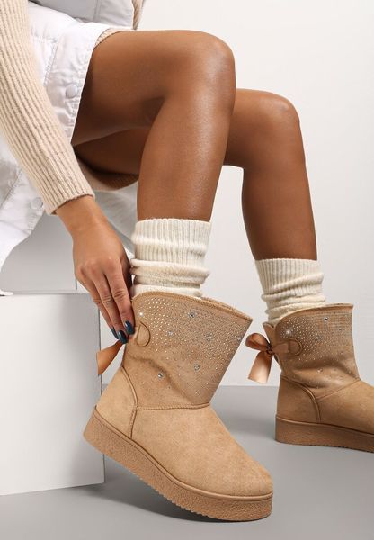 Śniegowce Susitna ozdobione kokardką z satyny oraz aplikacją z cyrkonii. Wsuwane, z wysoką cholewką, przeszyciami i okrągłym noskiem. Na grubej podeszwie z delikatnym protektorem. Wykonane z ekozamszu. Mocno ocieplane materiałem imitującym futerko. To wygodne buty na zimę, które dodadzą akcentu glamour stylizacjom! Oryginalna rozmiarówka jest zaniżona. Zapoznaj się z tabelą rozmiarów (sugerujemy zakup rozmiaru o […]