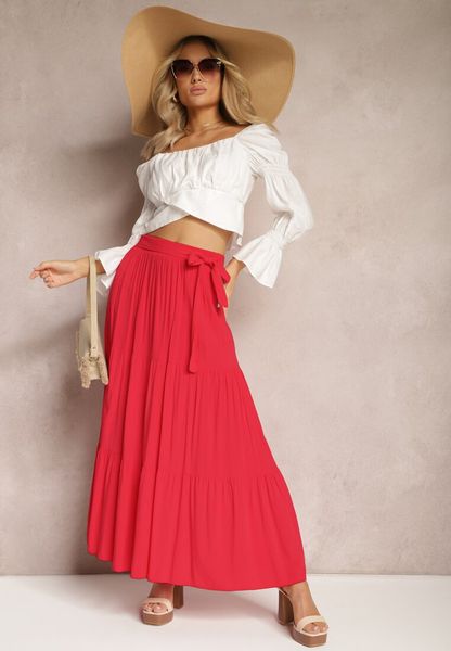 Czerwona Wiskozowa Spódnica Maxi z Gumką w Talii i Materiałowym Paskiem Taitum