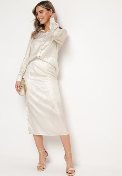 Jasnobeżowa Spódnica Midi z Rozcięciem na Boku i Metalicznym Połyskiem Citrulla