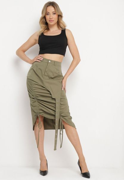 Ciemnozielona Spódnica Midi z Troczkami i Ozdobnym Wiszącym Paskiem Astellise