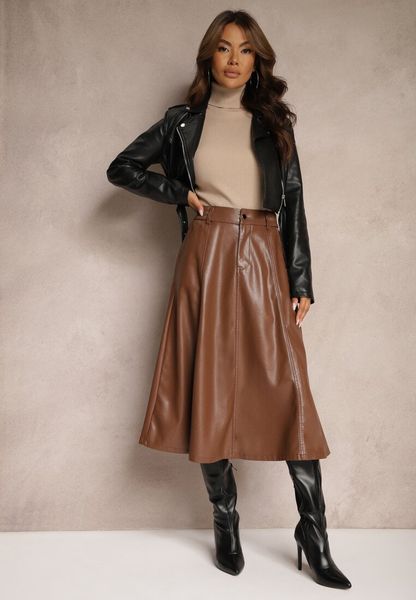 Brązowa Rozkloszowana Spódnica z Imitacji Skóry High Waist Evirenas