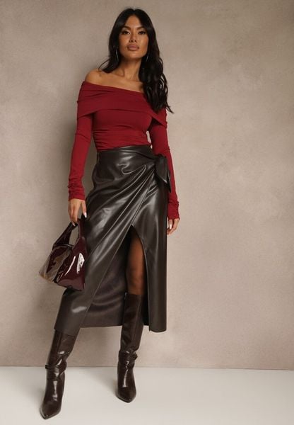 Brązowa Spódnica o Ołówkowym Kroju High Waist z Imitacji Skóry z Rozcięciem z Tyłu Eviauras