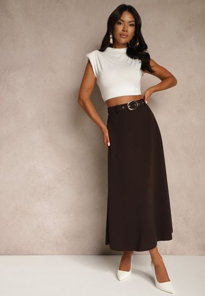 Brązowa Spódnica z Wiskozą o Rozkloszowanym Kroju z Paskiem Łańcuszkiem Lilethra