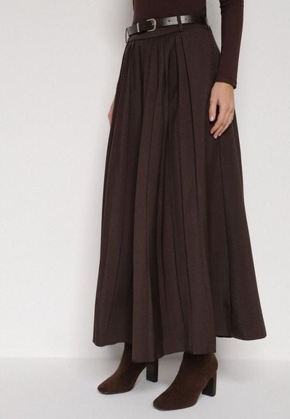 Brązowa Rozkloszowana Spódnica z Wiskozy z Dodatkowym Paskiem z Klamrą Lowedina