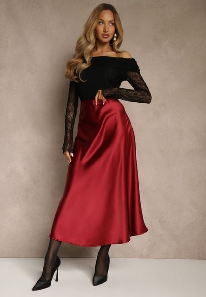 Bordowa Satynowa Midi Spódnica Rozkloszowana z Gumką w Pasie i Suwakiem Leose