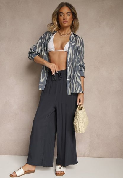 Granatowe Szerokie Spodnie z Wiskozy ze Sznurkiem Natisetia