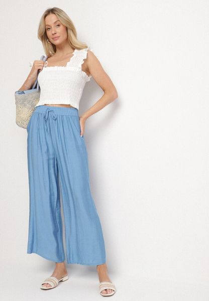 Niebieskie Szerokie Spodnie Palazzo z Wysokim Stanem i Wiązaniem Myrlevia