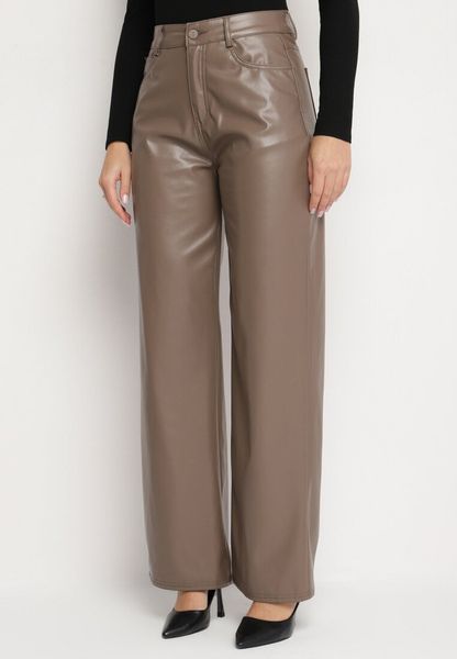 Jasnobrązowe Spodnie o Szerokim Kroju z Wysokim Stanem z Ekoskóry Enadria