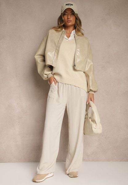 Beżowe Szerokie Spodnie z Elastyczną Gumką w Pasie i Kieszeniami Atealis