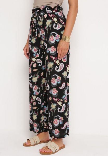 Czarno-Różowe Spodnie z Bawełny z w Stylu Boho z Szerokimi Nogawkami i Gumką w Talii Jelvia