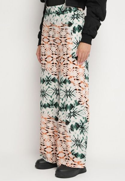 Zielono-Beżowe Spodnie Szerokie w Abstrakcyjny Wzór z Wiskozy Averina