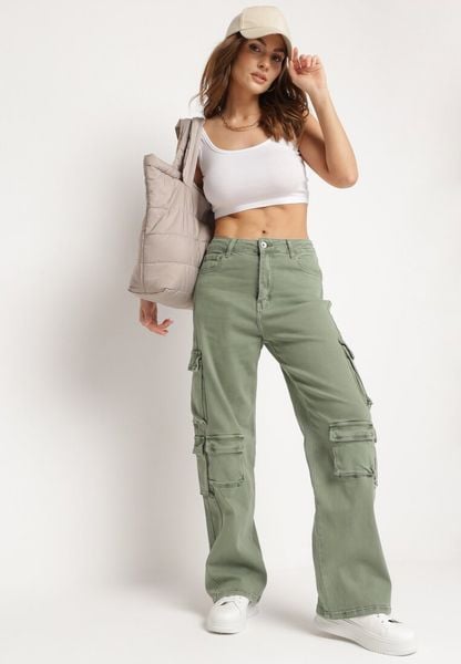 Zielone Spodnie Typu Bojówki z Bawełny High Waist z Kieszeniami Zefara