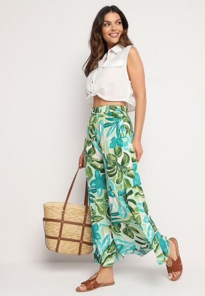 Jasnozielone Wiskozowe Spodnie Kuloty z Wysokim Stanem i Gumką w Pasie Ozdobione Liśćmi Vimarissa
