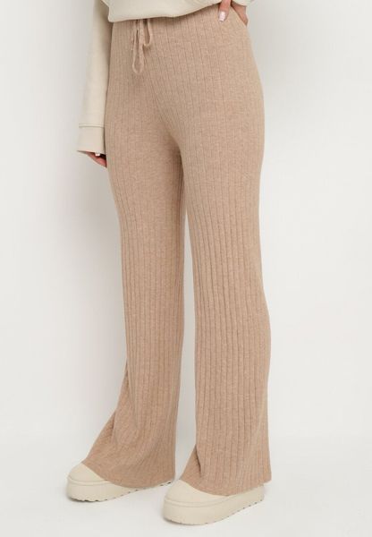 Ciemnobeżowe Dzianinowe Spodnie Prążkowane o Szerokim Kroju z Gumką w Talii Emalindrae