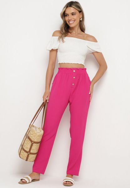 Fuksjowe Spodnie z Wysoką Talią Typu Paper Bag z Gumką w Pasie Noravia