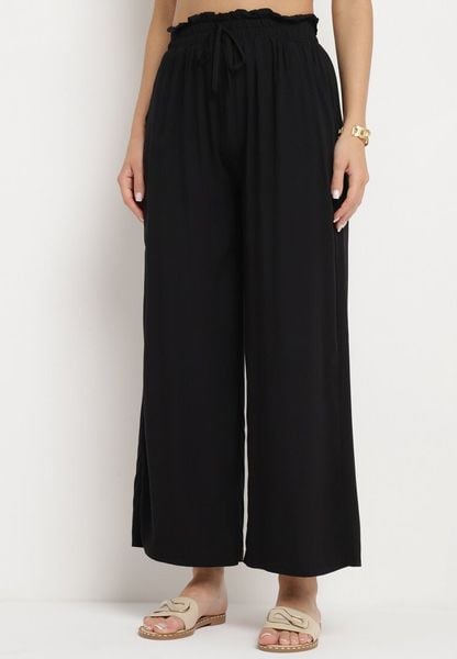 Czarne Spodnie Bawełniane Typu Palazzo z Wysokim Stanem i Gumką w Talii Fitanea