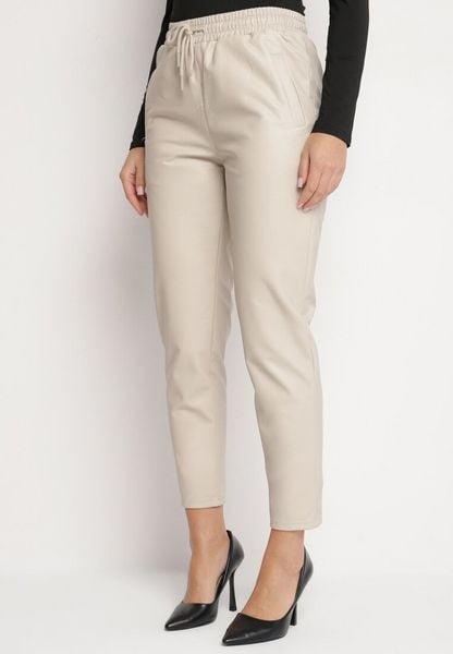 Beżowe Spodnie z Wysokim Stanem z Imitacji Skóry z Gumką w Pasie Esarienne