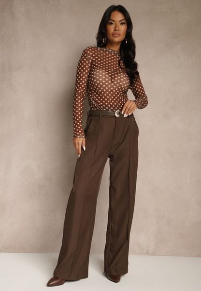 Brązowe Szerokie Spodnie Garniturowe z Paskiem z Klamrą w Kształcie Muszelki Setera