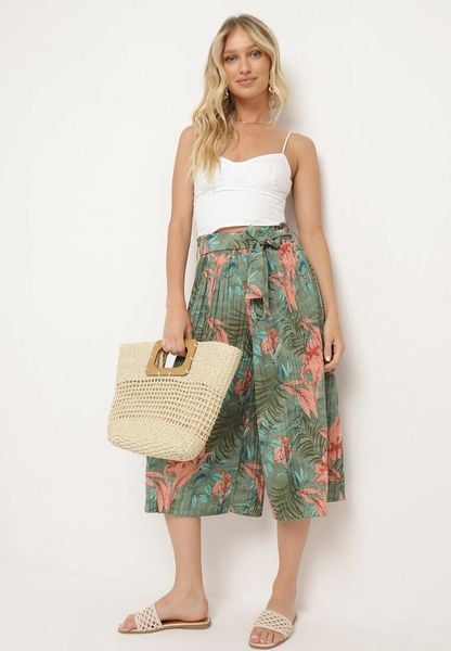 Zielone Spodnie z Szerokimi Nogawkami Typu Kuloty z Wysokim Stanem i Gumką w Talii Vikiila