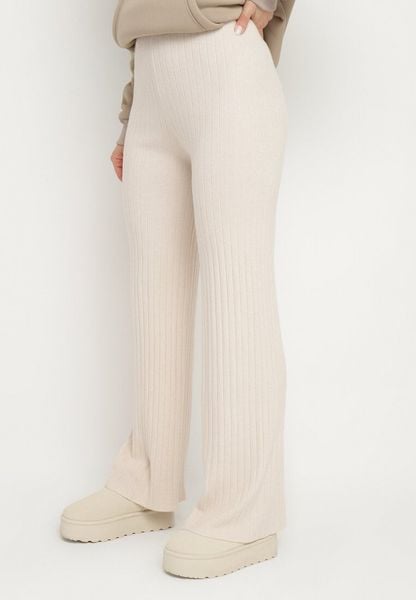 Jasnobeżowe Dzianinowe Spodnie Prążkowane o Szerokim Kroju z Gumką w Talii Emalindrae